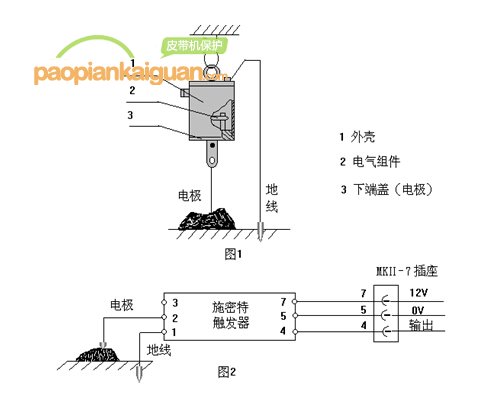 參照圖1和圖2,將KGU3B型堆煤開關(guān)吊掛在檢測物料點的上方,用帶MKⅡ-7插頭的電纜插到PROMOS系統(tǒng)的輸入口,用金屬桿或鏈吊掛在電極上,自然下垂,長短按檢測要求調(diào)節(jié),再用一個導線將外殼接地(接到檢測物料的下方,并接觸良好)即可,對煤和水不需調(diào)節(jié)。