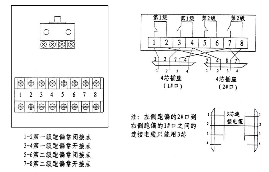 跑偏傳感器分別安裝于皮帶輸送機(jī)機(jī)頭部與機(jī)尾部?jī)蓚?cè)的機(jī)架上。跑偏傳感器軸輥在正常狀態(tài)下(無(wú)跑偏時(shí)),軸輥與皮帶邊緣線正交(垂直),兩者間距離大約在5cm。當(dāng)皮帶因偏載而發(fā)生跑偏時(shí),皮帶與軸輥相互摩擦,并迫使軸輥發(fā)生偏移,當(dāng)軸輥擺動(dòng)角≥25°時(shí),第一級(jí)微動(dòng)開關(guān)動(dòng)作,發(fā)出預(yù)警信號(hào),當(dāng)軸輥擺動(dòng)角≥35°時(shí),第二級(jí)微動(dòng)開關(guān)動(dòng)作,切斷皮帶輸送機(jī)控制回路停機(jī)或向監(jiān)控站發(fā)出跑偏故障信號(hào)。當(dāng)故障排除后,跑偏傳感器軸輥又恢復(fù)到正常狀態(tài)。電氣原理圖如圖10-1所示。