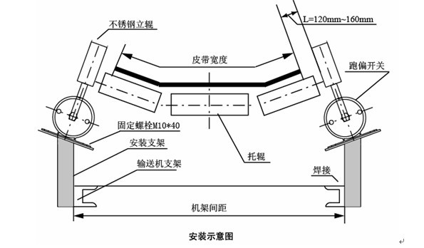 2、安裝跑偏開關(guān)應(yīng)選擇輸送裝置易出現(xiàn)跑偏的位置處安裝,參考應(yīng)用單位工藝要求,同時(shí)要考慮皮帶與擋輪的有效間距和推力,建議皮帶與檔輪間的安裝距離為120-160mm(詳見安裝示意圖)。