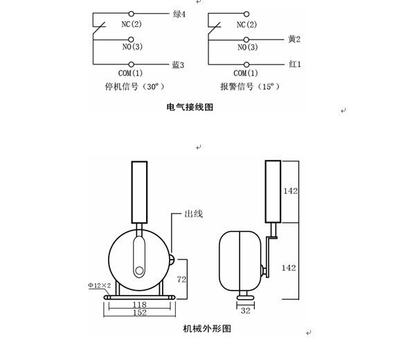 4、跑偏開關(guān)出廠時(shí)配有長度0.5米四芯橡套電纜,芯線上配有1、2、3、4線號,其中1、2為常開接點(diǎn)是一級報(bào)警信號,3、4為常閉接點(diǎn)是二級停機(jī)信號。