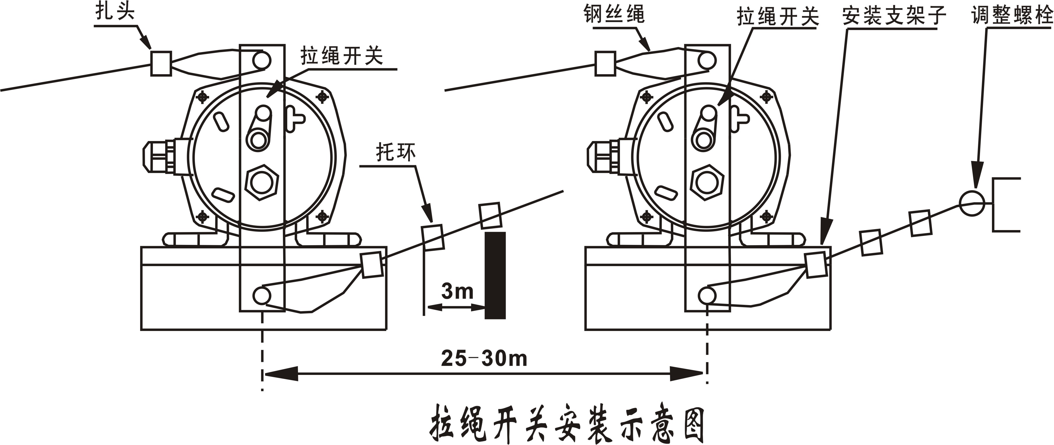 3、為減小鋼絲繩自重對(duì)拉線開關(guān)啟動(dòng)的影響,每隔3m在機(jī)架上裝一個(gè),以支撐鋼絲繩。